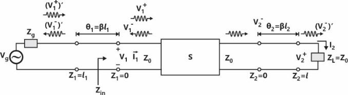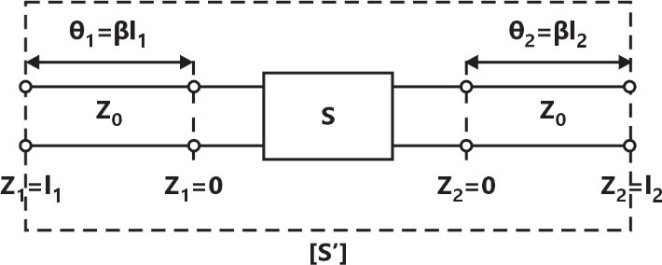 with reference to . Two lossless transmission line sections of electrical lengths and are added to the input and output ports for measurement purposes, respectively. The Sparameters of the resultant two port network is