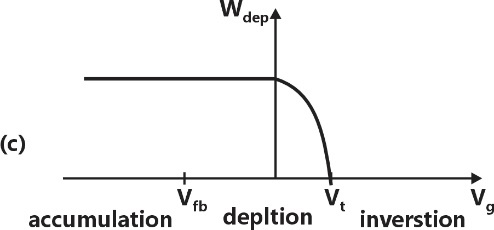 For a MOS capacitor, and are the flat-band voltage and the threshold voltage, respectively. The variation of the depletion width for varying gate voltage is best represented by