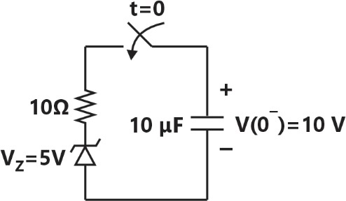 As shown in the circuit, the initial voltage across the capacitor is , with the switch being open. The switch is then closed at . The total energy dissipated in the ideal Zener diode after the switch is closed (in , rounded off to three decimal places) is ________.