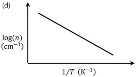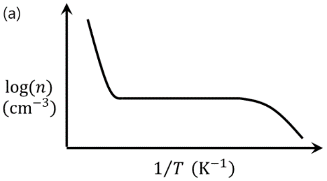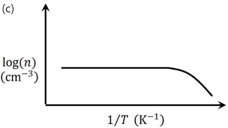 For non-degenerately doped n-type silicon, which one of the following plots represents the temperature (𝑇) dependence of free electron concentration (𝑛)