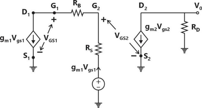 In the circuit shown below, the transistors and are biased in saturation. Their small signal transconductances are and respectively. Neglect body effect, channel length modulation and intrinsic device capacitances.