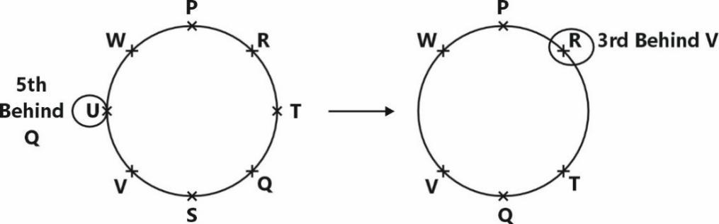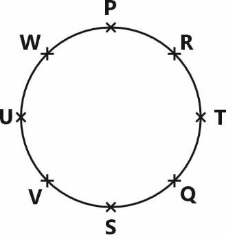 Eight students (P, Q, R, S, T, U, V, and W) are playing musical chairs. The figure indicates their order of position at the start of the game. They play the game by moving forward in a circle in the clockwise direction.