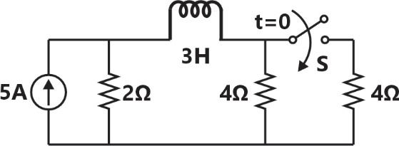 In the circuit shown below, switch S was closed for a long time. If the switch is opened at t=0, the maximum magnitude of the voltage in volts, is ________ (rounded off to the nearest integer).
