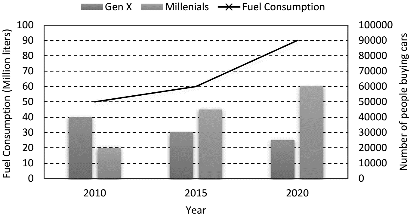 The chart below shows the data of the number of cars bought by Millennials and Gen X people in a country from the year 2010 to 2020 as well as the yearly fuel consumption of the country (in Million liters).