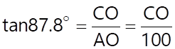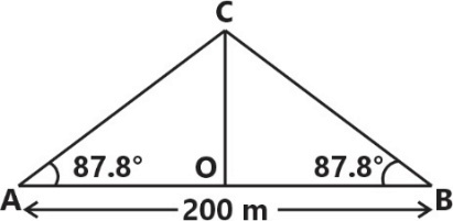 A surveyor has to measure the horizontal distance from her position to a distant reference point C. Using her position as the center, a 200 m horizontal line segment is drawn with the two endpoints A and B. Points A, B, and C are not collinear. Each of the angles and are measured as . The distance (in m) of the reference point C from her position is nearest to