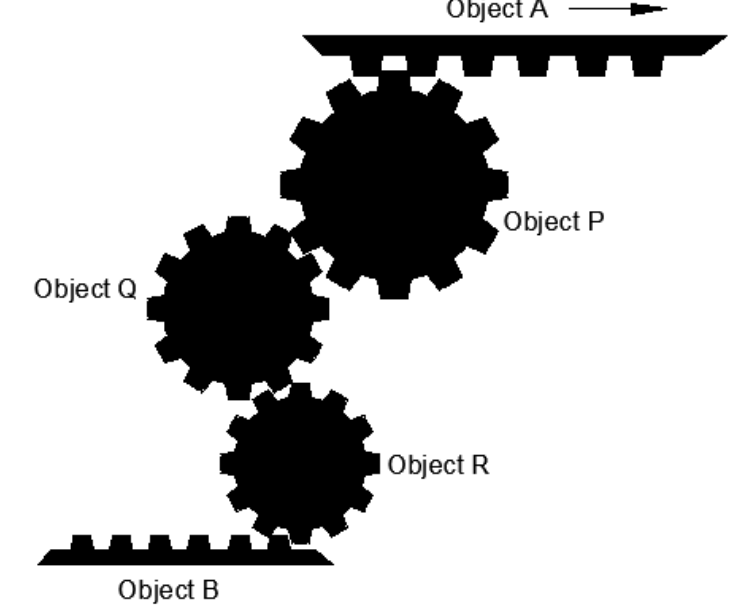 The assembly shown below has three teethed circular objects (Pinions) and two teethed flat objects (Racks), which are perfectly mating with each other. Pinions can only rotate clockwise or anti-clockwise staying at its own center. Racks can translate towards the left or the right direction.