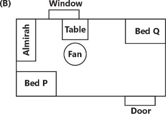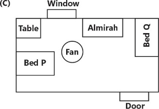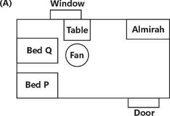 P and Q have been allotted a hostel room with two beds, a study table, and an almirah. is an avid bird-watcher and wants to sit at the table and watch birds outside the window. Q does not mind that as long as his bed is close to the ceiling fan.