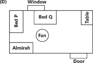 Bed of Q must be near the ceiling fan and the table should be placed near to the window. Only Option A satisfies this requirement.