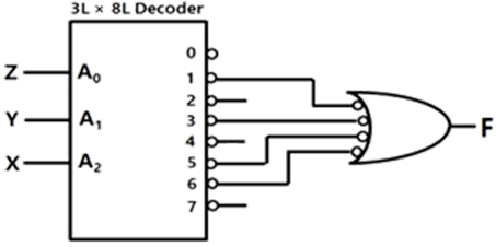 A 3 line to 8 line decoder, with active low outputs, is used to implement a 3-variable Boolean function as shown in the figure.