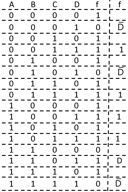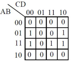 The SOP (sum off products) form of a Boolean function is , where inputs are A, B, C, D (A is MSB, and D is LSB). The equivalent minimized expression of the function is
