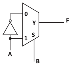 Consider the following circuit which uses a 2-to-1 multiplexer as shown in the figure below. The Boolean expression for output F in terms of A and B is