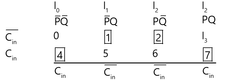 Figure shows a 4 to 1 MUX to be used to implement the sum S of a 1-bit full adder with input bits P and Q and the carry input. Which of the following combinations of inputs to and of the MUX will realize the sum S?