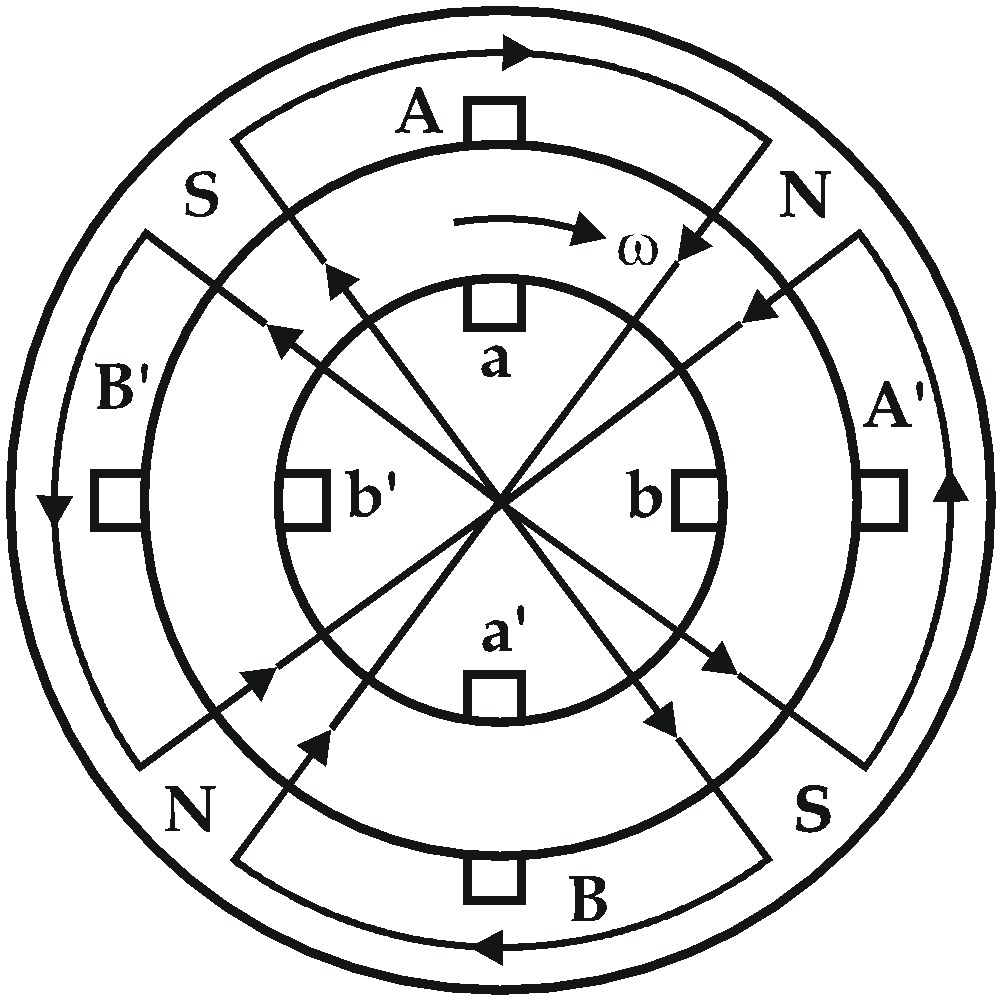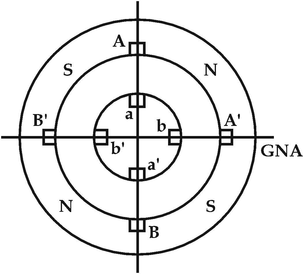 Geometry Neutral Axis (GNA) lies at 90° electrical to pole axis ie. at 45° mechanical to poles axis. GNA is shown in figure below.