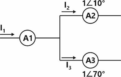 Current through ammeters and in fig. are 1 ∠ 10° and 1 ∠ 70° respectively. The reading of the ammeter A1 (rounded off to 3 decimal places) is _________ A.