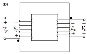 Which one of the following options represents possible voltage polarities in a single phase two winding transformer? Here, is the applied primary voltage, is the induced primary voltage, is the open circuit secondary voltage, and is the induced secondary voltage.