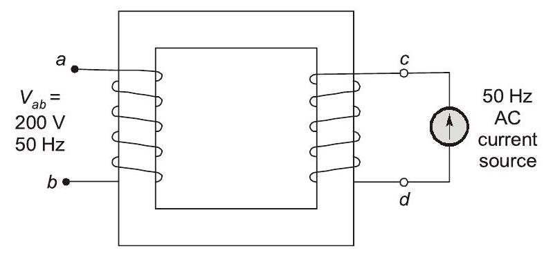 When the winding of the single-phase, , two winding transformer is supplied from an AC current source of frequency , the rated voltage of (rms), is obtained at the open-circuited terminals . The cross sectional area of the core is and the average core length traversed by the mutual flux is . The maximum allowable flux density in the core is and the relative permeability of the core material is 5000. The leakage impedance of the winding and winding at are and , respectively. Considering the magnetizing characteristics to be linear and neglecting core loss, the self-inductance of the winding a-b in millihenry is _________ (Round off to 1 decimal place).