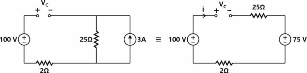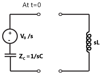 At t = 0+ S is opened & inductor is replaced by a current source & capacitor is replaced by a voltage source.
