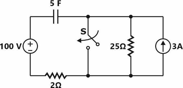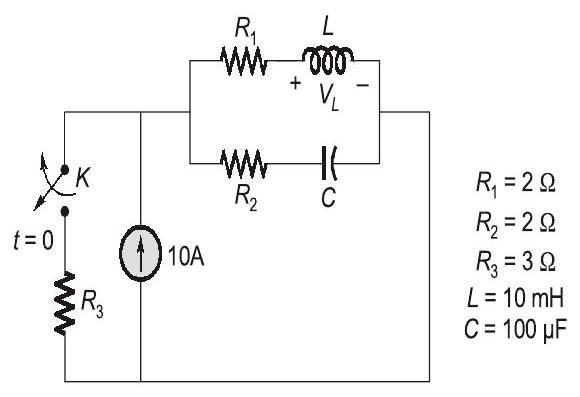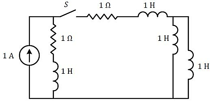 A constant current source is supplying 10A to a circuit shown in Figure. The switch S, which is initially closed for a sufficiently long time, is suddenly opened. Obtain obtain the complete time response of the inductor current. What is the energy stored in L, a long time after the switch is opened?